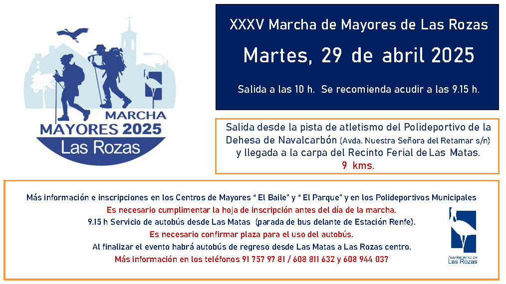 La Marcha del Mayor de Las Rozas Alcanza su 35 edición, la prueba consiste en cubrir caminando los casi 9 km que hay desde Navalcarbón hasta la plaza de José Prat, en Las Matas. Durante el recorrido los mayores atravesaron zonas urbanas, aunque fundamentalmente la prueba discurrió por parajes naturales. Los mayores dispusieron de puestos de avituallamiento con agua y del soporte asistencial de los voluntarios de Protección Civil y el SAMER..