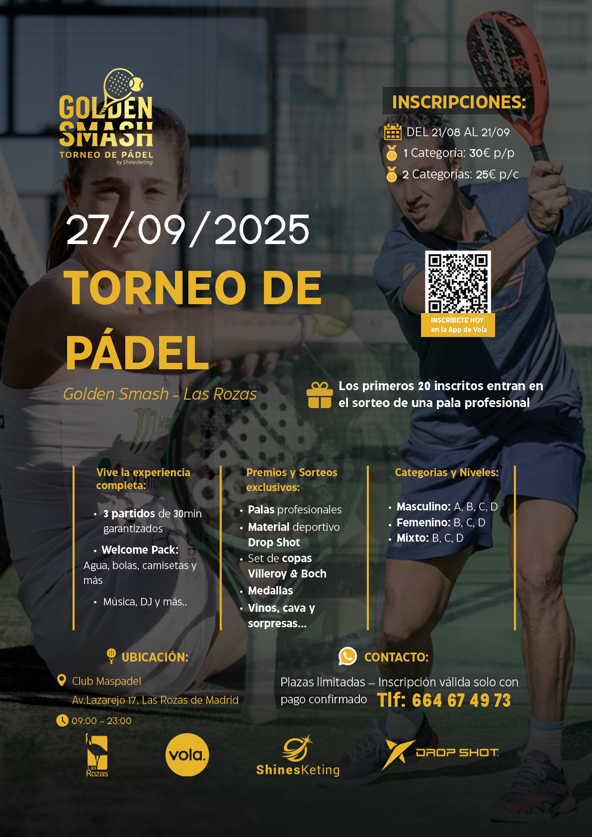 Las inscripciones ya están abiertas a través de la App Vola Padel (disponible en App Store y Google Play), buscando el torneo “Golden Smash”.