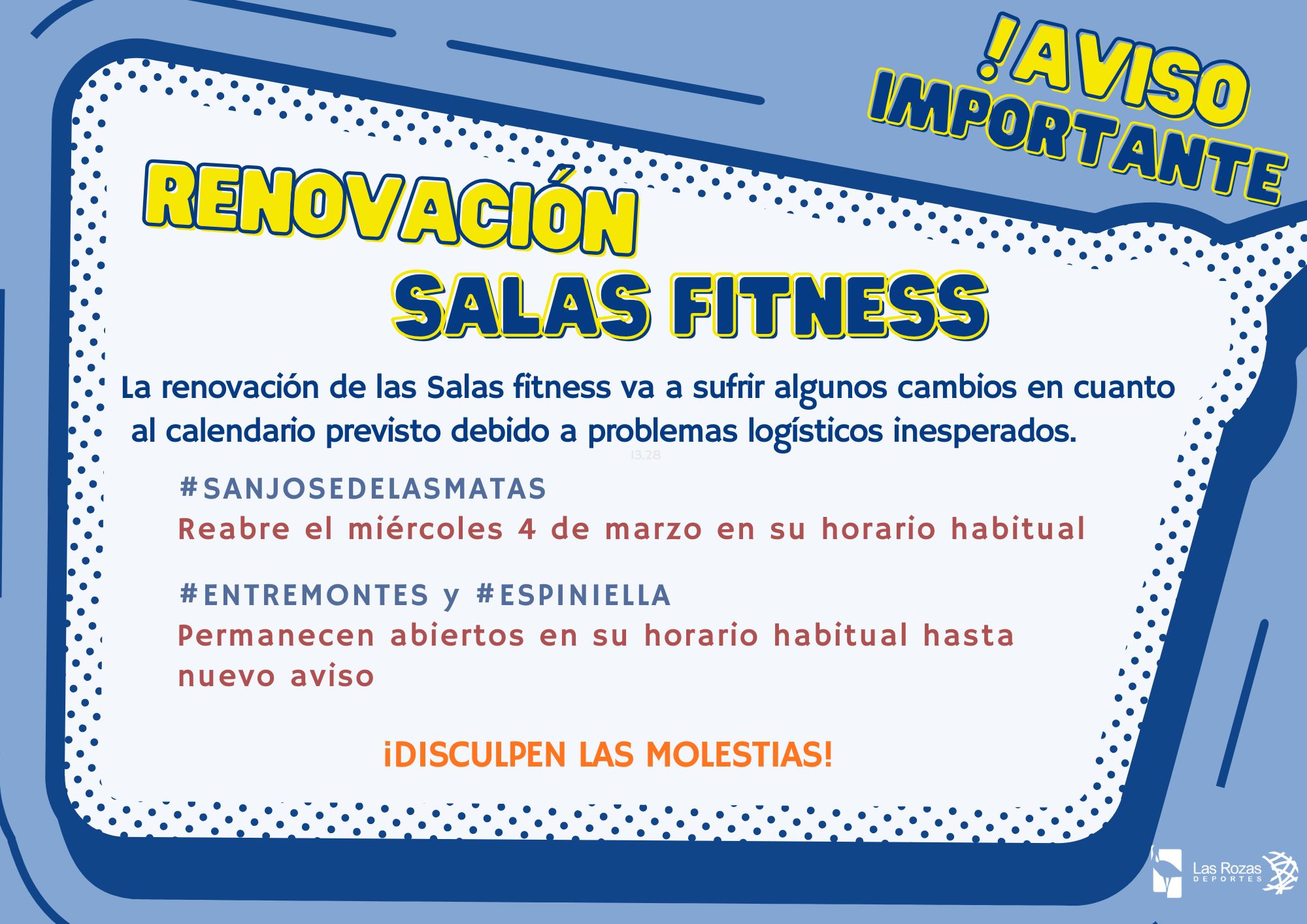 En breve anunciaremos el calendario de remodelación de las Salas de los polideportivos Entremontes y Alfredo Espiniella, hasta la fecha de cambio ambos polideportivos continuarán abiertos en el horario habitual