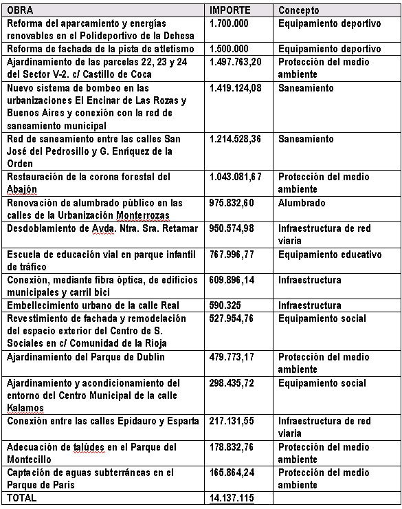 El Ayuntamiento de Las Rozas presentará 17 proyectos para su financiación por el Fondo Estatal de Inversión Municipal que aprobó el Gobierno Central hace unas semanas. El Consistorio agotará los 14.137.115 de euros que le corresponde a la ciudad por criterios de población.