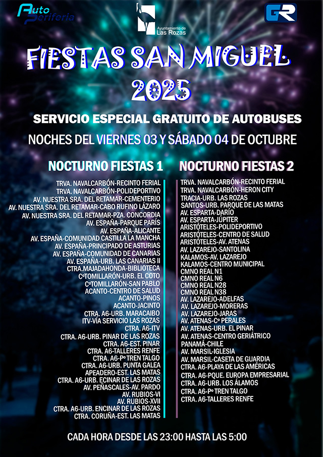 Con motivo de las Fiestas de San Miguel 2025 y para mejorar la movilidad y seguridad de los vecinos, el Ayuntamiento de Las Rozas pondrá en marcha un servicio especial de autobuses nocturnos gratuitos durante las dos noches de más afluencia de personas.