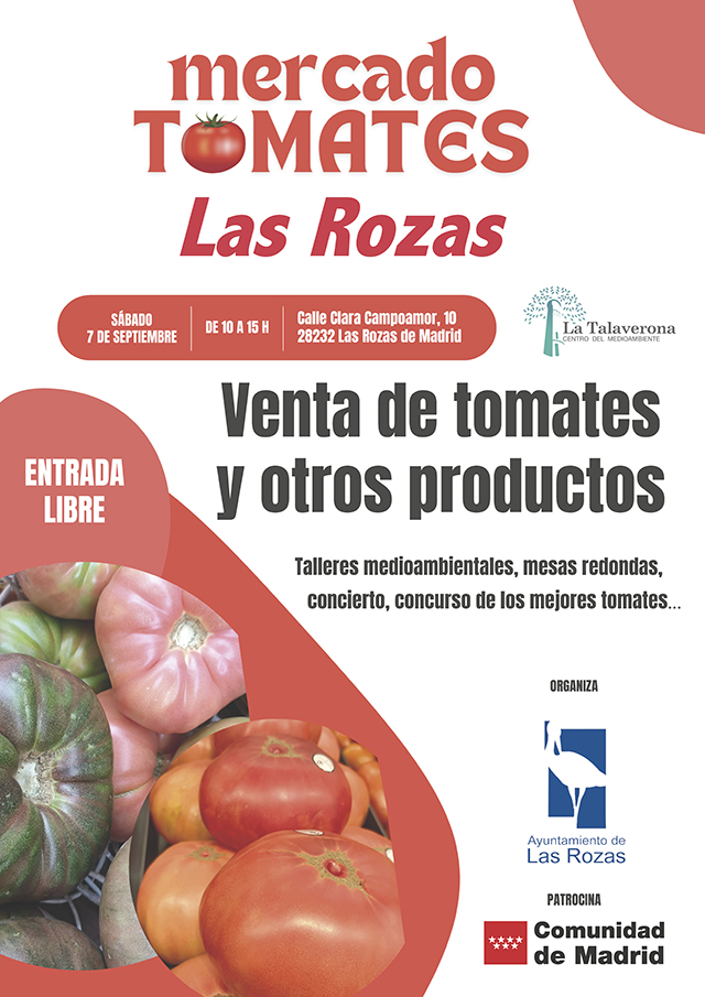 El Centro del Medioambiente La Talaverona de Las Rozas, acogerá este sábado, 7 de septiembre, en horario de 10 a 15 horas, el Mercado de Tomates y otros productos del campo. Una cita organizada por el Ayuntamiento de Las Rozas, con el patrocinio de la Dirección General de Agricultura, Ganadería y Alimentación de la Comunidad de Madrid, en la que participarán productores, agricultores y hortelanos que quieran vender su cosecha a cuantos clientes acudan a conocer, degustar y comprar este valioso fruto.